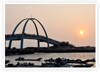 王者之弓橋-絕讚的觀夕照據點 王者之弓橋位於漁港出海口,港區的南緣,為一座跨港景觀橋,其造型係以本地地名「王功」引申「王者之弓」構思。王者之弓橋橋長82公尺,寬4.5公尺;拱頂高20公尺,橋版面最高8公尺。橋樑材質採用最容易塑形之鋼料,呈現幾何之美,塑造彰化海岸地區性景觀為意象。 |